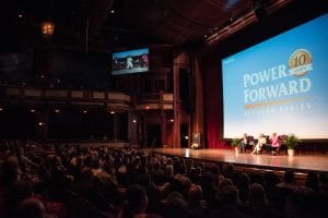 In her opening remarks, First Commerce CEO Cecilia Homison noted the vison for Power Forward 10 years ago was to inspire local business leaders and give them tangible ideas for nurturing and growing their companies – along with budding entrepreneurs including students. She said over the past decade, audiences have witnessed unforgettable moments with Power Forward speakers—from Steve Wozniak’s foreshadowing of AI to another “Shark” Mr. Wonderful’s (Kevin O’Leary) insights on Wicked Good Cupcakes, and last year’s inspiring pitch to students by Zillow co-founder Spencer Roscoff.