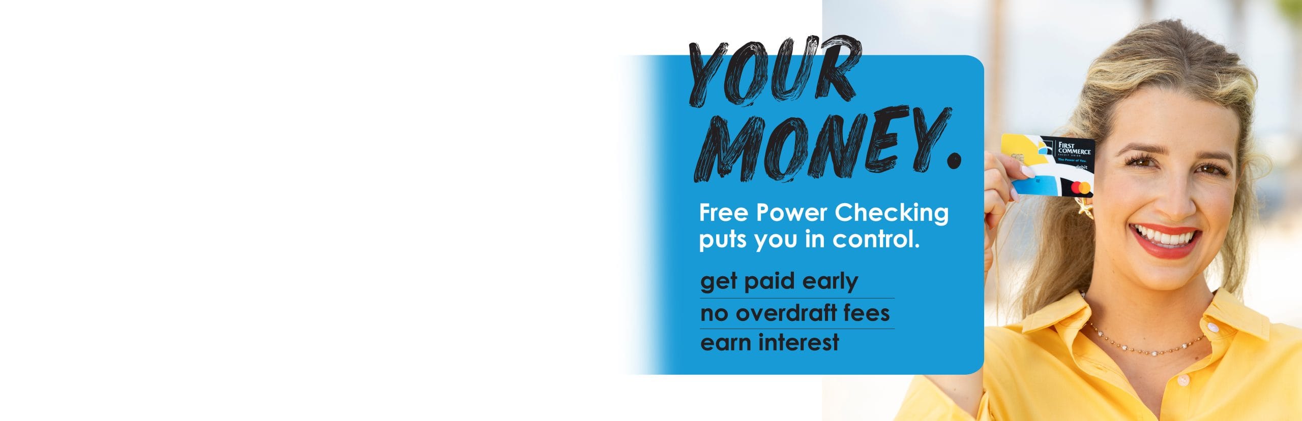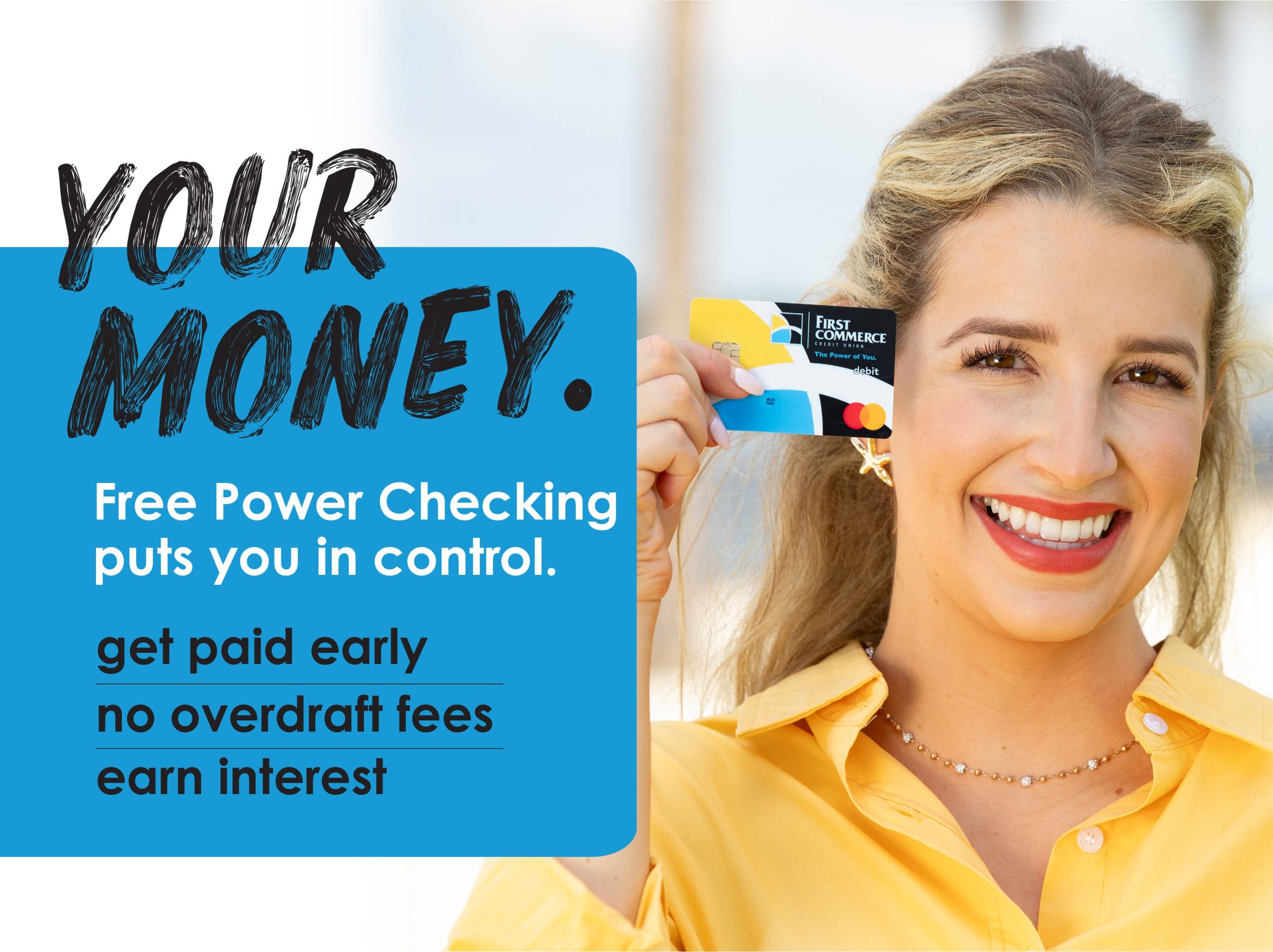 Life moves fast, and your money should keep up. With FREE Power Checking from First Commerce, you’re in charge.